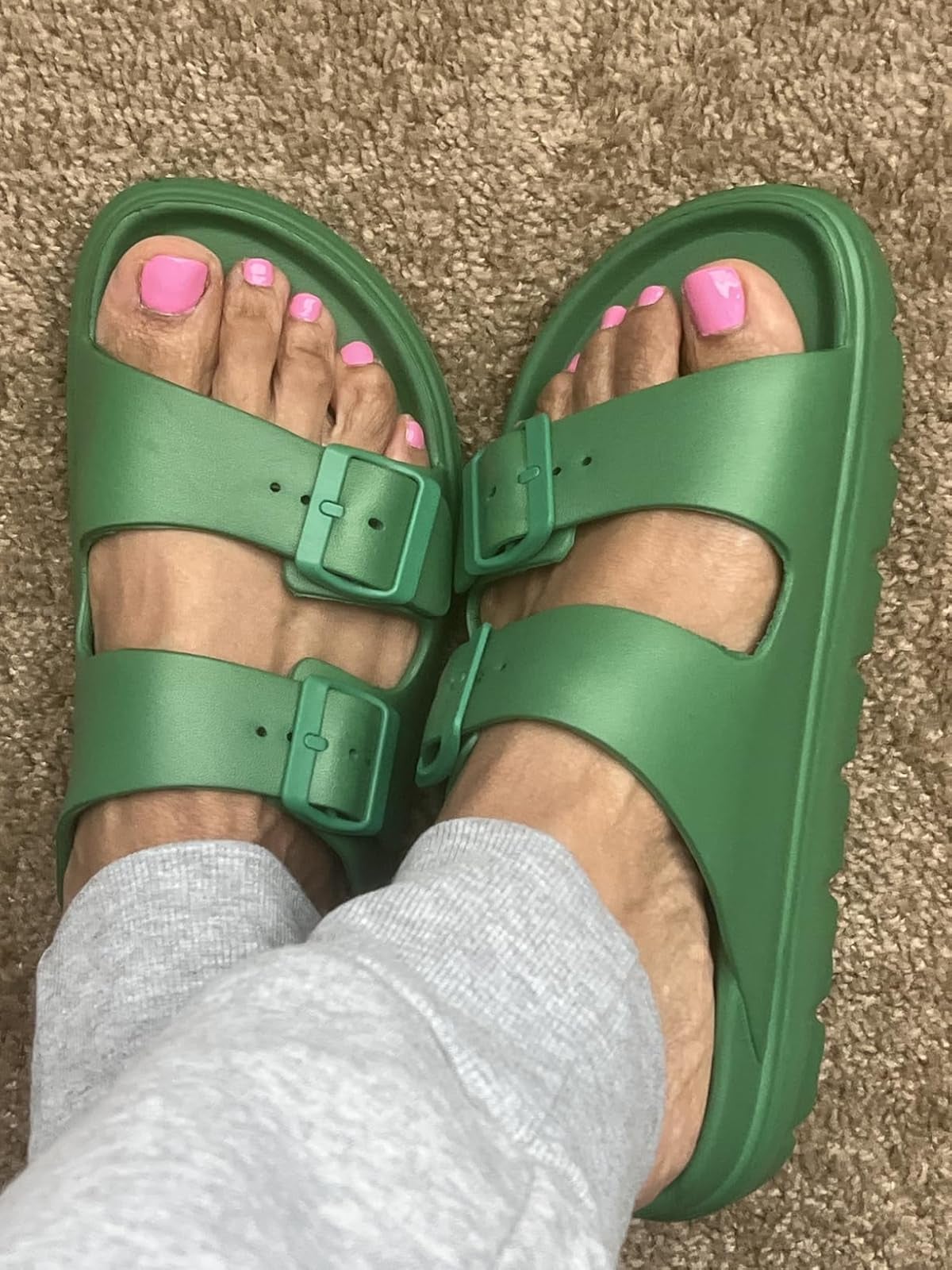 Promising review: "I LOVE these sandals and have bought them in different colors. I was reluctant at first because my feet are very narrow, but a size 7 fit me exactly as my other size 7 shoes do. The buckles are also adjustable for those with narrow or wide feet. They are super comfortable and provide a good amount of arch support. I used to get hip pain from walking in flip-flops, but I haven't had it since I've worn these. I really love the variety of colors and how they go with shorts, sundresses, or even jeans. I wear them when I'm gardening, as house slippers, and going out. I would highly recommend these sandals, especially because of how cheap they are compared to many other shoes." —Kat Platt